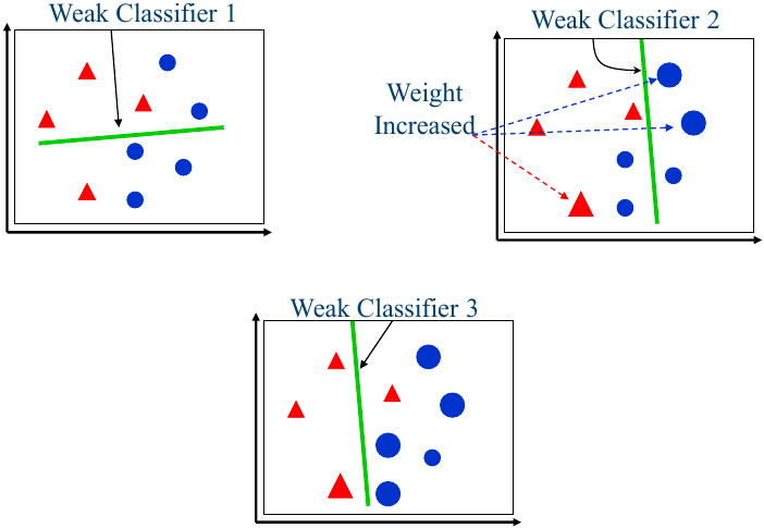 数据很少,用复杂的模型可能导致过拟合,所以第一次使用比较弱的感知机,有3个点分错了,增加它们的权重,使它们更可能被抽取到作为下一次的训练样本。第二次分类后,再强调分错的2个蓝点。第三次分类,就只有1个红点分错了。Ensemble 使得模型不复杂,更准确