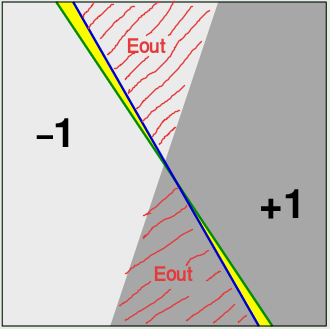 白色与灰色分界线是 unknown target function。 蓝线和绿线是两个 hypothesis。 假设 h 与真实界线所差的面积(红色阴影)是$E_{out}$,黄色面积是 $\Delta E_{out}$。$E_{in}$未在图中体现,需要对整个面积空间采样,样本点落在 $E_{out}$ 中的个数是$E_{in}$,样本点落在黄色区域内的个数是$\Delta E_{in}$。 $h_1$ 与 $h_2$ 有很大的重叠,$|E_{in}(h_1) - E_{out}(h_1)| \approx |E_{in}(h_2)-E_{out}(h_2)|$