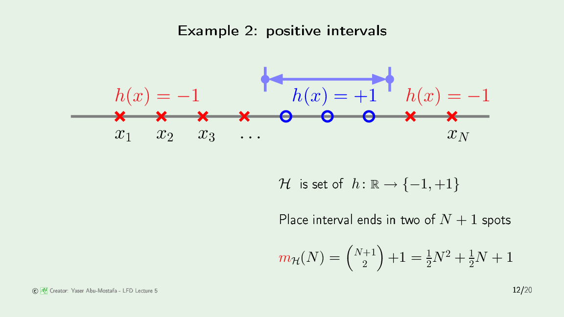 正区间只能处理中间有一段是+1,两侧是-1的配置。需要用两个边界 (threshold) 来确定一个区间:一共有N个点,形成N+1个空,在这N+1个空里选两个,就形成了一个区间,所以是 $C_{N+1}^2$,再加上两个边界在同一个空的情况。