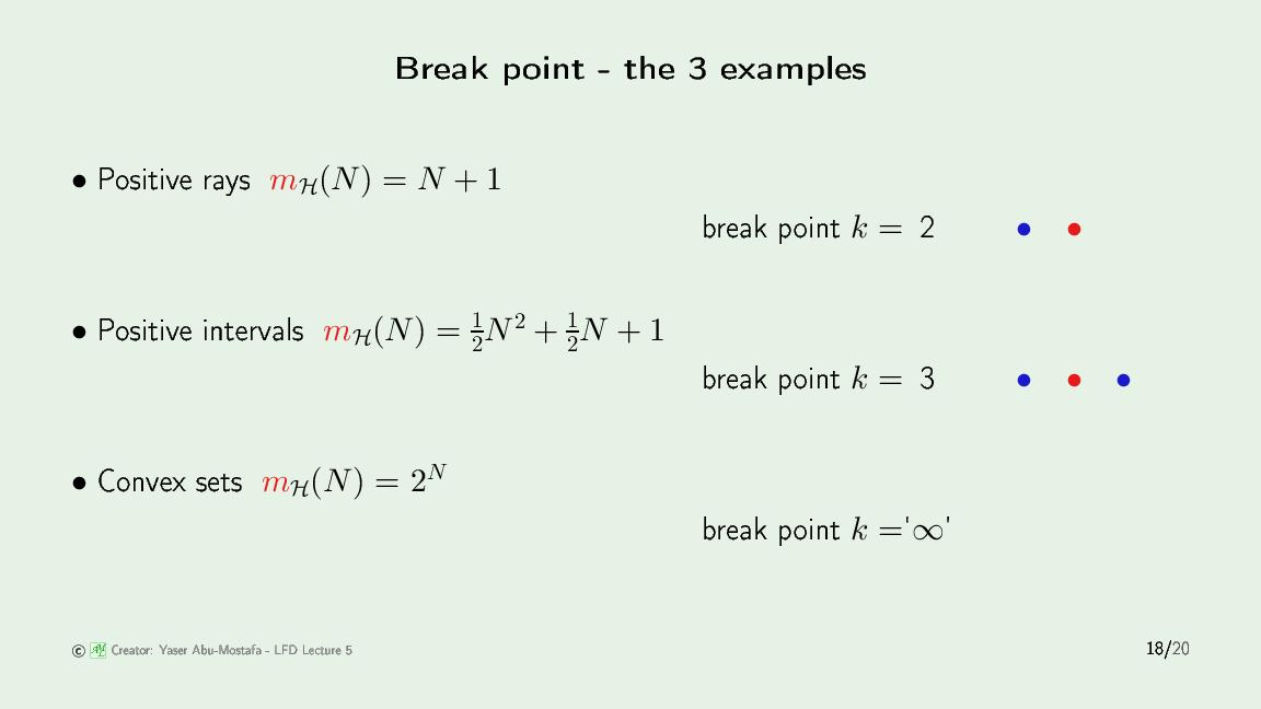 凸集可以把任意颜色配置的N个点完全分开,凸集里面是+1,外面是-1。所以它的growth function 是 $2^N$,凸集模型没有break point。