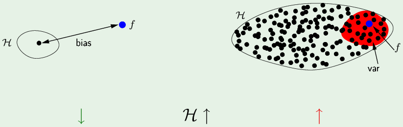 如果假设集中只有一个假设 h,它与 $f$ 的距离就是 bias(方差为0)。如果是一个复杂的假设集,其中包含很多假设,更有可能囊括了 f,在它附近的都是“最佳假设”(红色),因为平均假设$\bar g(\mathbf x)$就在 f 附近所以bias较小,而方差比较大(很多小值加起来也会大)。