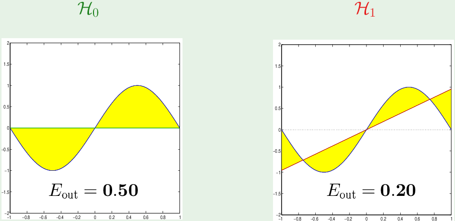 最终,$\mathcal H_0$ 的 Eout= 0.50+0.25 = 0.75,$\mathcal H_1$ 的 Eout=0.21+1.69 = 1.9。根据 Eout,简单的假设集 $\mathcal H_0$ 好于复杂的假设集 $\mathcal H_1$。因为我们是从 Ein “泛化” 到 out,如果Eout 太大,Generalization bound 太大,Ein 与 Eout 相差太大,二者不follow,就不能通过Ein 学习到 Eout.