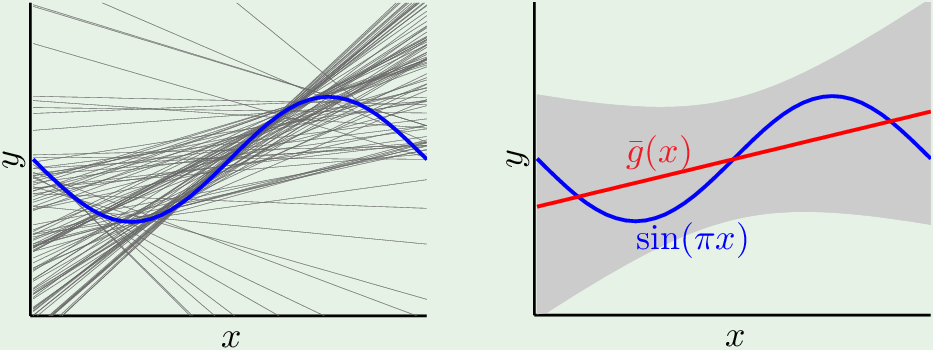 $$ \begin{aligned} \mathbb E_{\mathcal D} \left[ E_{out} \left( g^{(\mathcal D)} \right) \right] = \mathbb E_{\mathcal D} \left[ \mathbb E_{\mathbf x} \left[ \left( g^{(\mathcal D)}(\mathbf x) - f(\mathbf x) \right)^2 \right] \right] \