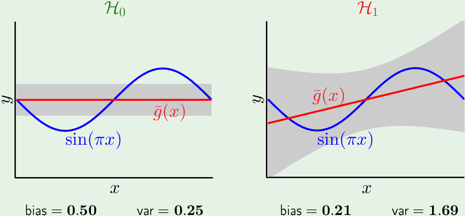 只有一个参数的,最简单的(常数)假设集 $\mathcal H_0$ 的(平均假设) bias大,方差小。而比较复杂的(直线)假设集 $\mathcal H_1$ 的 bias 小,方差大。
