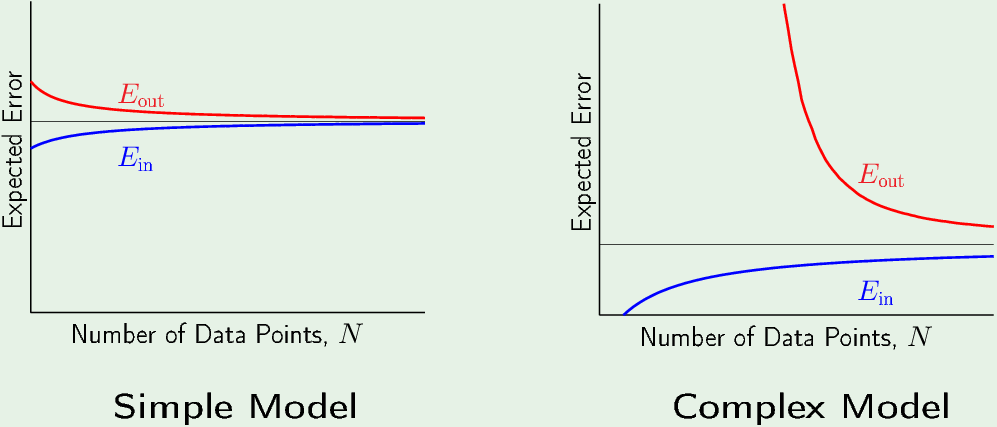 对于Complex Model,“平均假设”更靠近 f,bias较小,所以黑色水平线它更低,同样随着N增大,Eout与Ein 不断趋近于 “平均假设”。但是当N很小的时候,Eout很大(方差很大)。Eout 与Ein 差距很大,复杂模型相较于简单模型的 Generalization bound 更大。复杂模型的 Ein 在样本很少的时候是零,因为在样本数小于VC维或者假设集的effective参数自由度时,模型可以把所有点全部分开 (shatter all the points)。在超过VC维之后,Ein开始增加。