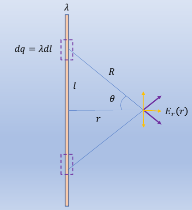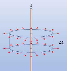 例一:均匀带电的无限长直线的线电荷密度为$λ$,求空间电场分布。