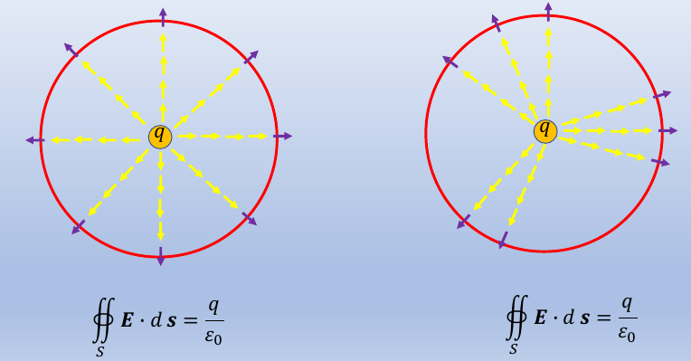 $$ ∯_S \pmb{E}\cdot d\pmb{s} = \oiint_S \frac{q}{4πε_0r^2}r^2dΩ=\frac{q}{ε_0} $$与球面中心电荷情况一致