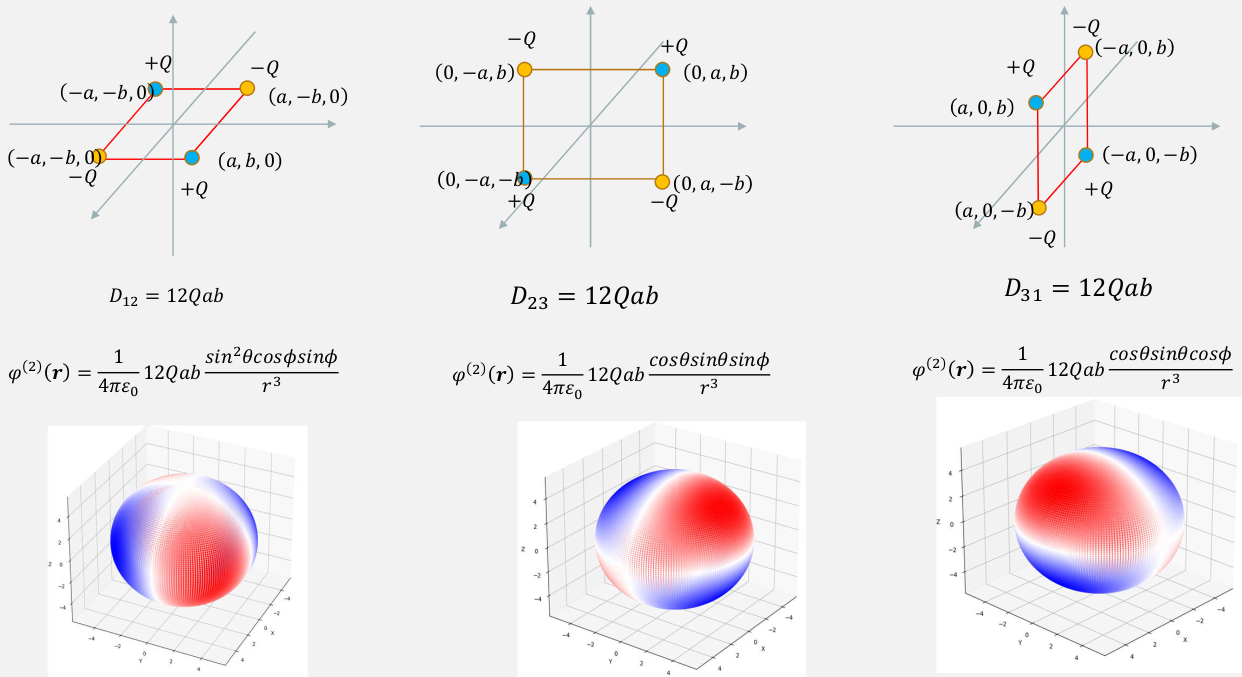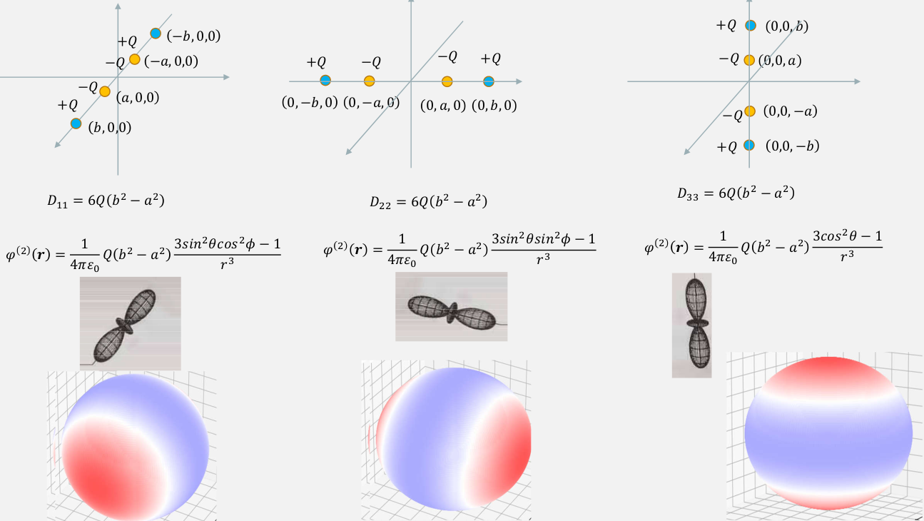 $$ \begin{aligned} φ_{10}(r,θ,ϕ) &=\frac{1}{ε_0} \frac{1}{3} \sqrt{\frac{3}{4π}}p_z \sqrt{\frac{3}{4π}}\frac{z}{r^3} \\ &=\frac{p_z z}{4πε_0 r^3} \end{aligned} $$这就是电偶极的 $p_z$ 分量的贡献: