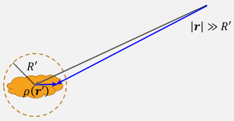 例3:对于在一个半径不超过 $R'$ 的空间里分布着电荷密度为 $ρ(\mathbf{r'})$的电荷,用球谐函数表示在电荷区域以外空间的电势分布。