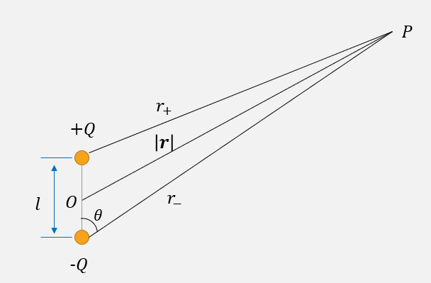 $$ φ(r,θ,ϕ) = \frac{1}{ε_0} \sum_{l=0}^{+∞}\sum_{m=-l}^{m=l} \left[\frac{1}{2l+1} \int_V r'^l\ Y_{lm}^*(θ,ϕ) ρ(\mathbf{r'})\ dV' \right] \frac{Y_{lm}(θ,φ)}{r^{l+1}} \tag{1.10.6} $$可以看出,电势分布是一系列 $r^{-l-1}$ 项求和,这与电多极的形式类似,下面验证上式中$l=0,1,2$ 分别对应着电单极,电偶极和电四极。