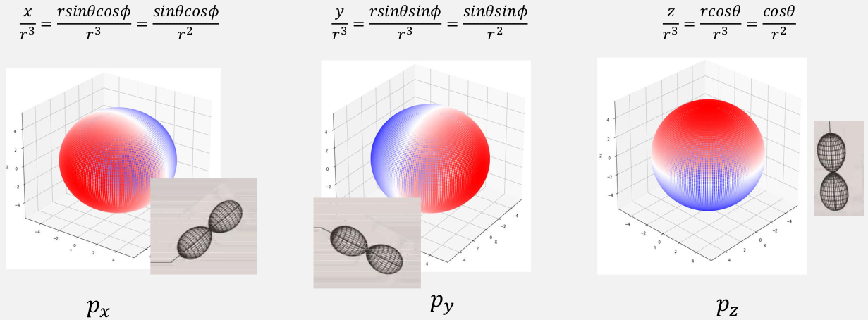 可以将 $\varphi_{11}(\theta,\phi), \varphi_{10}(\theta,\phi), \varphi_{1-1}(\theta,\varphi)$,三个正交归一函数可以改写成:$\frac{[Y_{1-1}(\theta,\phi) - Y_{11}(\theta,\phi)]}{\sqrt{2}},\ \frac{[Y_{11}(\theta,\phi) + Y_{1-1}(\theta,\phi)]}{\sqrt{2}i},\ Y_{10}(\theta,\phi)$,这三个正交归一函数,如果这3个函数展开,则对应结果就分别为:$p_x, p_y, p_z$。