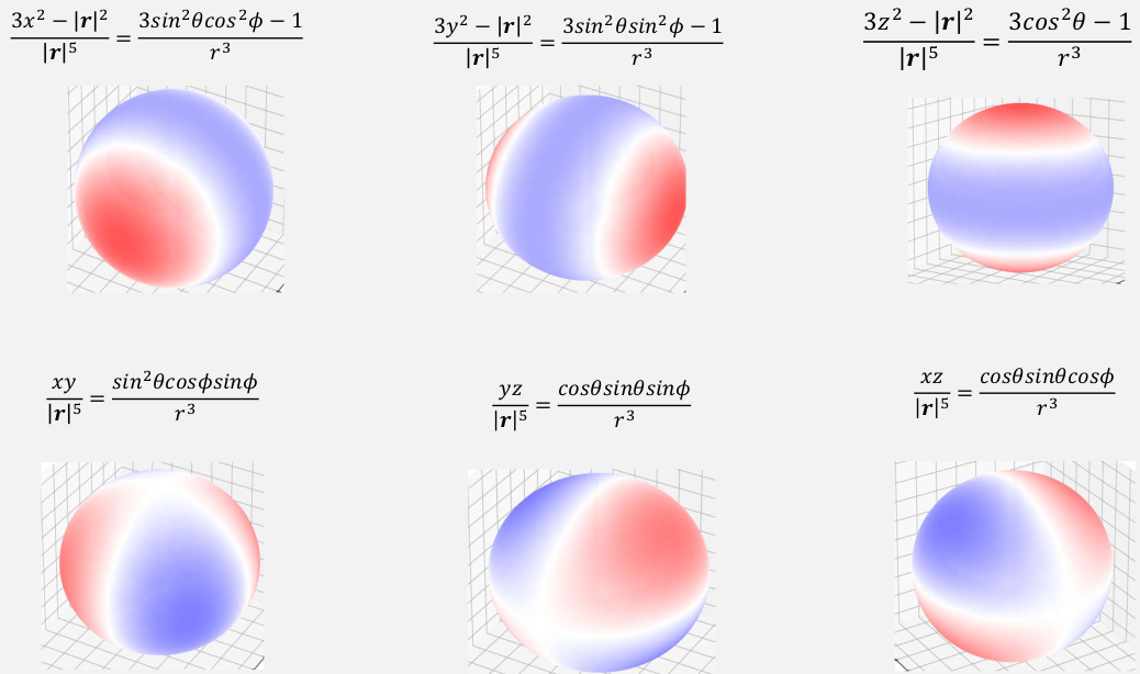 $$ \begin{aligned} φ_{11}(r,θ,ϕ) &= \frac{1}{ε_0} \frac{1}{3} \sqrt{\frac{3}{8π}}(p_x-ip_y) \sqrt{\frac{3}{8π}}\frac{x+iy}{r^3} \\ &= \frac{1}{4π ε_0r^3} \frac{(p_x-ip_y)(x+iy)}{2} \\ &= \frac{1}{4πε_0 r^3} \frac{p_xx+p_yy+i(p_xy-p_yx)}{2} \end{aligned} $$除了 $p_x$和$p_y$ 分量的贡献外还有一个虚部的交叉项,下面可以看到 1-1 项是11 项的复共轭,两者求和可以把这个虚部消掉