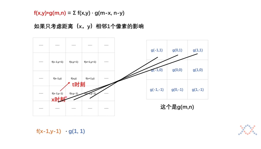 如果只考虑点(x,y) 周围相邻1个像素对它的影响,并且每个相邻像素对当前像素的影响由卷积核g规定。比如要求像素f(x-1,y-1)对f(x,y)的影响,就是它本身乘以对应的比例g。 类比吃饭的例子,f(x,y)是t时刻,f(x-1,y-1)是x时刻,x时刻吃的食物到了t时刻还剩下百分之$g(t-x)$,所以 $f(x-1,y-1)$ 对应的比例为 $g(x-(x-1), y-(y-1)) = g(1,1)$,图片像素位置f与卷积核中g的位置并不一一对应,而是要旋转180度。
