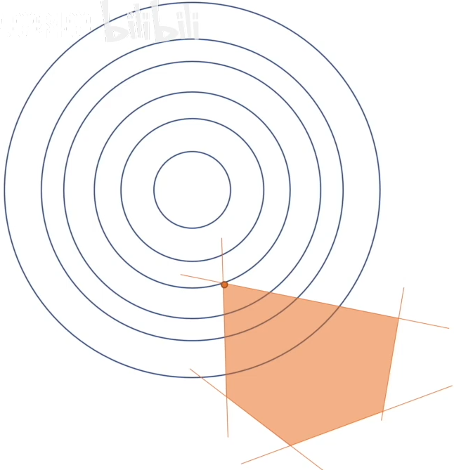 2在图1中,坐标系是x-y,同心圆是目标函数 $f(x,y)$ 的等高线,圆心点对应的函数值最小,越往外值越大。红线是(x,y)约束条件。