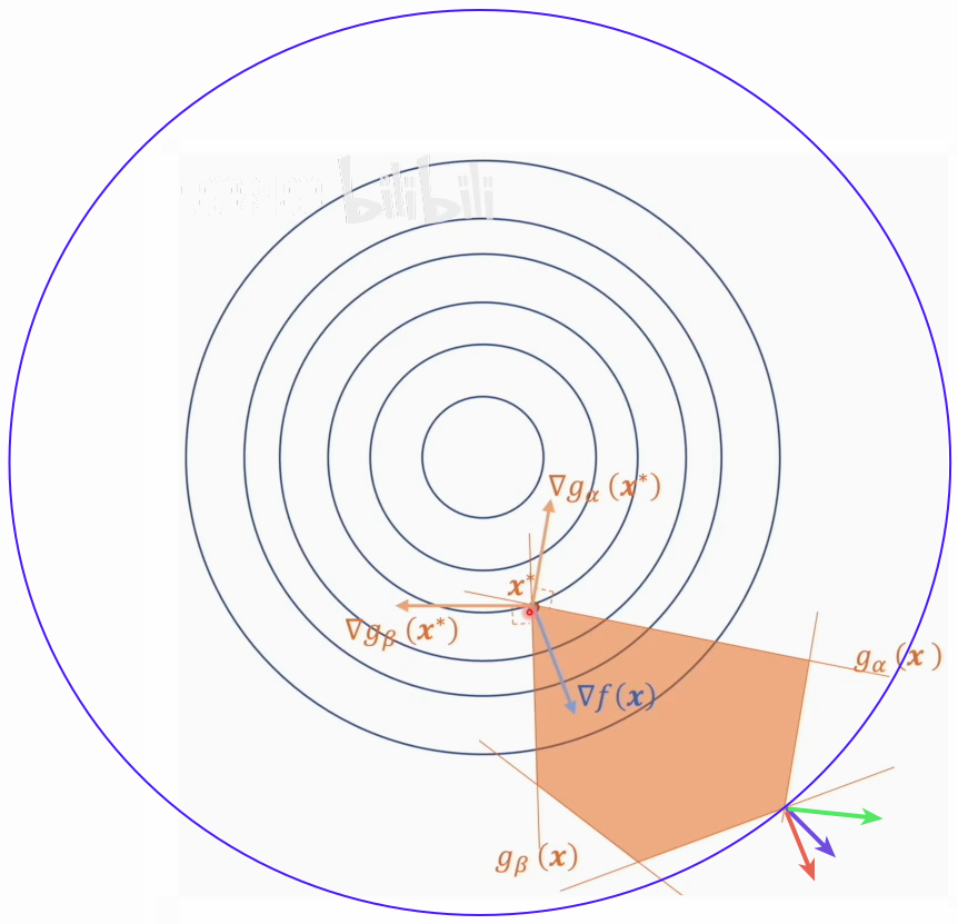 $$ \begin{aligned} & g_α(x') = g_β(x') = 0 \\ & λ_α ∇ g_α(x') + λ_β ∇ g_β(x') = -∇ f(x) ⇒ λ_α, λ_β≠0 \end{aligned} $$而该点 x’ 也满足其他约束条件 gᵢ(x’)<0,但它们的 λᵢ 都等于0,不起作用: λᵢ∇ gᵢ(x)=0 ⇒ λᵢ=0 (i≠α,β) λ 不能小于 0,否则会把梯度方向取反,会参与梯度叠加。