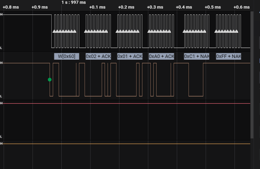 Receiver Response: Every 8 bits (1 byte), the SDA should be a low voltage, representing