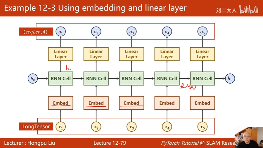 独热向量$x_n$通过嵌入层 Embed 变成稠密的表示,经过RNN线性变换后,再用一个线性层,让最后的隐变量输出与分类的数量一致