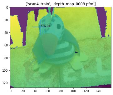 read_pfm():1 2 3 4 5 6 7 8 9 10 11 12 13 14 15 16 17 18 19 20 21 22import imageio import matplotlib.pyplot as plt from pathlib import Path from datasets.data_io import read_pfm depth_path = Path("../DTU_Depths_raw/scan4_train/depth_map_0008.pfm") depth_pfm, scale = read_pfm(depth_path) # (128,160), 1.0 depth_png = imageio.imread("../DTU_Depths_raw/scan4_train/depth_visual_0008.png") orig_rgb = imageio.imread("../mvs_training/dtu/Rectified/scan4_train/rect_009_3_r5000.png") orig_rgb = orig_rgb[::4,::4,:] # reduce 4 times q_x, q_y = int(190/4), int(125/4) # query point plt.text(x=q_x, y=q_y, s=f'{depth_pfm[q_x, q_y]:.2f}') plt.vlines(x=q_x, ymin=q_y-12.5, ymax=q_y+12.5) plt.hlines(y=q_y, xmin=q_x-12.5, xmax=q_x+12.5) plt.imshow(depth_pfm) # plt.imshow(depth_png, alpha=1) plt.imshow(orig_rgb, alpha=0.2) plt.title(str(depth_path).split('/')[2:])