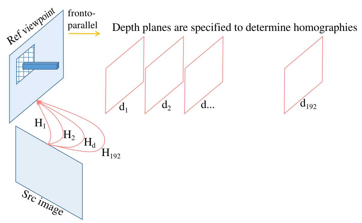 According to the principle of homography, pixels on the reference view’s feature map are mapped linearly onto each source view.