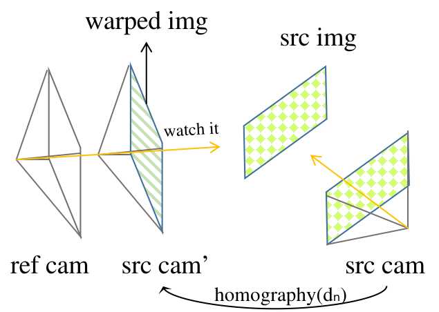 “Arbitrary camera geometries” means that the epipolar constraint served as the base of two-view stereo could fail, e.g. when no overlapping regions exist in the 2 views. In such a case, however, homography still holds. homography - Carleton UniversityTherefore, MVSNet transforms all feature maps into the reference-view camera space.