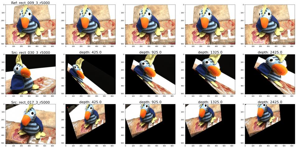 A source image is warped using a homography, solved with a certain depth $dₙ$, to supplement the reference view with information from a lateral perspective, although the scale doesn’t match: