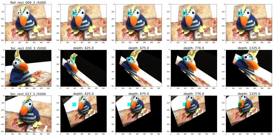I probably thought of (on 2023-12-16) that after warping, the feature vectors at the same location correspond to a same 3D point, like eipolar. But that’s not right even for the warping with the accurate depth value (776 mm) as shown in the above demo. The image (or feature map) moved indeed after warping, but not got the exact position corresponding to the common 3D point.