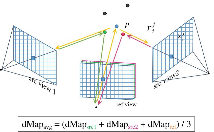 The fused depth map of a ref view is the average of refined depth maps after applying the photometric and geometric constraints on each pair of the ref and a src view