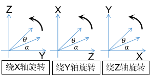 y-z平面旋转,用待定系数法或展开三角函数,可得旋转关系为: $\begin{cases} x'=x \\\\ y'=ycosθ-zsinθ \\\\ z'=ysinθ+zcosθ \end{cases}$,