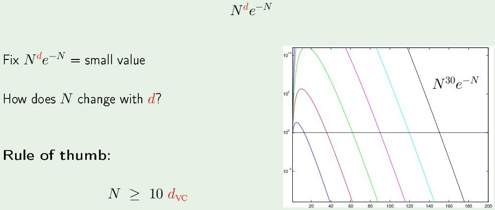 $d_{VC}$越大,概率会先上升得越高,之后负指数take the control,突然急剧减小。因为这是概率,所以只考虑小于1 ($10^0$ 以下)的部分,概率越小越好。