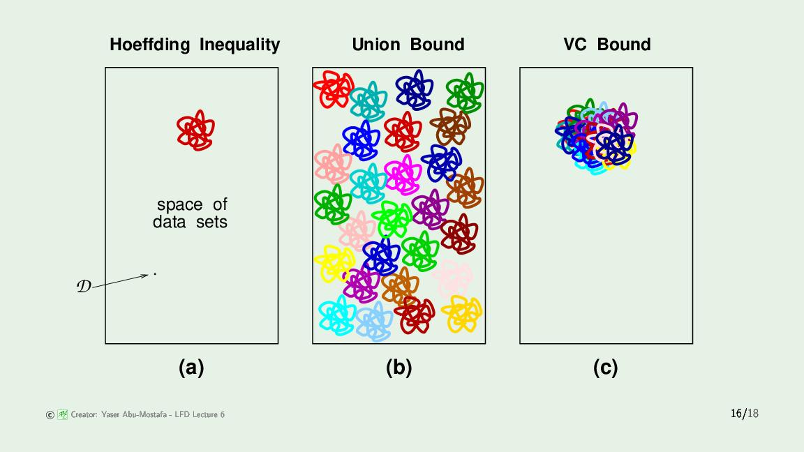 $$ \begin{aligned} \mathbb P [ |E_{in}(g) - E_{out}(g)| & > \varepsilon] \leq 2\ M\ e^{-2\varepsilon^2 N} \quad \text{(Union bound)} \ & \Downarrow \text{(Not quite)} \ \mathbb P [ |E_{in}(g) - E_{out}(g)| & > \varepsilon] \leq 2\ m_{\mathcal H}(N)\ e^{-2\varepsilon^2 N} \ \end{aligned} $$