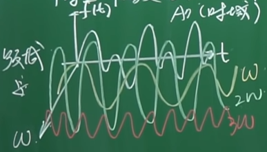 如上图,在频率方向上,一个周期性波可以分解成一个频率为 w 的正弦函数,与一个频率为 2w 的分量(振幅比较大),再与一个频率为 3w 的分量(振幅比较小)相加。