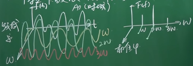 任何一个周期性的函数都可以分解成以上 3 个标准正交基的线性组合。 (sin(nwt) 与 cos(nwt) 是一对,拆不开?)