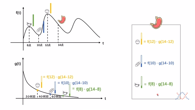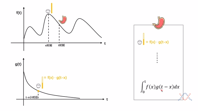 一般情况,求t时刻的胃中还剩多少食物:x时刻吃的食物f(x),经过了(t-x)时间,还剩下的比例是$g(t-x)$,乘以总量就是x时刻吃的食物到t时刻还剩多少$f(x)\cdot g(t-x)$,对t之前每一时刻吃的东西到了t时刻还剩多少,加起来:$\int_0^t f(x) g(t-x) dx$