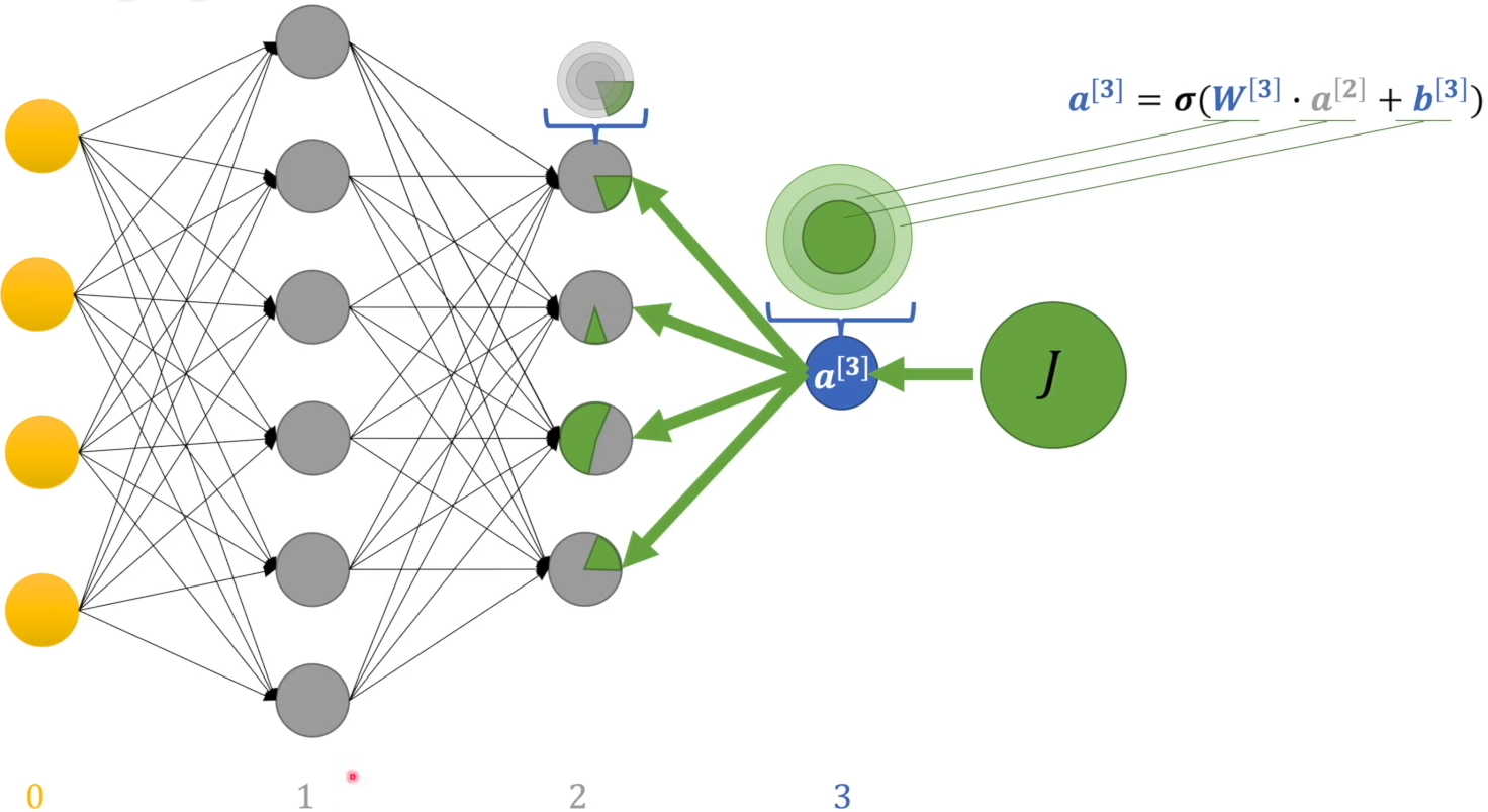$$ \begin{aligned} \alpha &= \frac{\partial J}{\partial \mathbf w^{[3]}} \ \gamma &= \frac{\partial J}{\partial b^{[3]}} \ \beta &= \frac{\partial J}{\partial \mathbf a^{[2]}} \end{aligned} $$