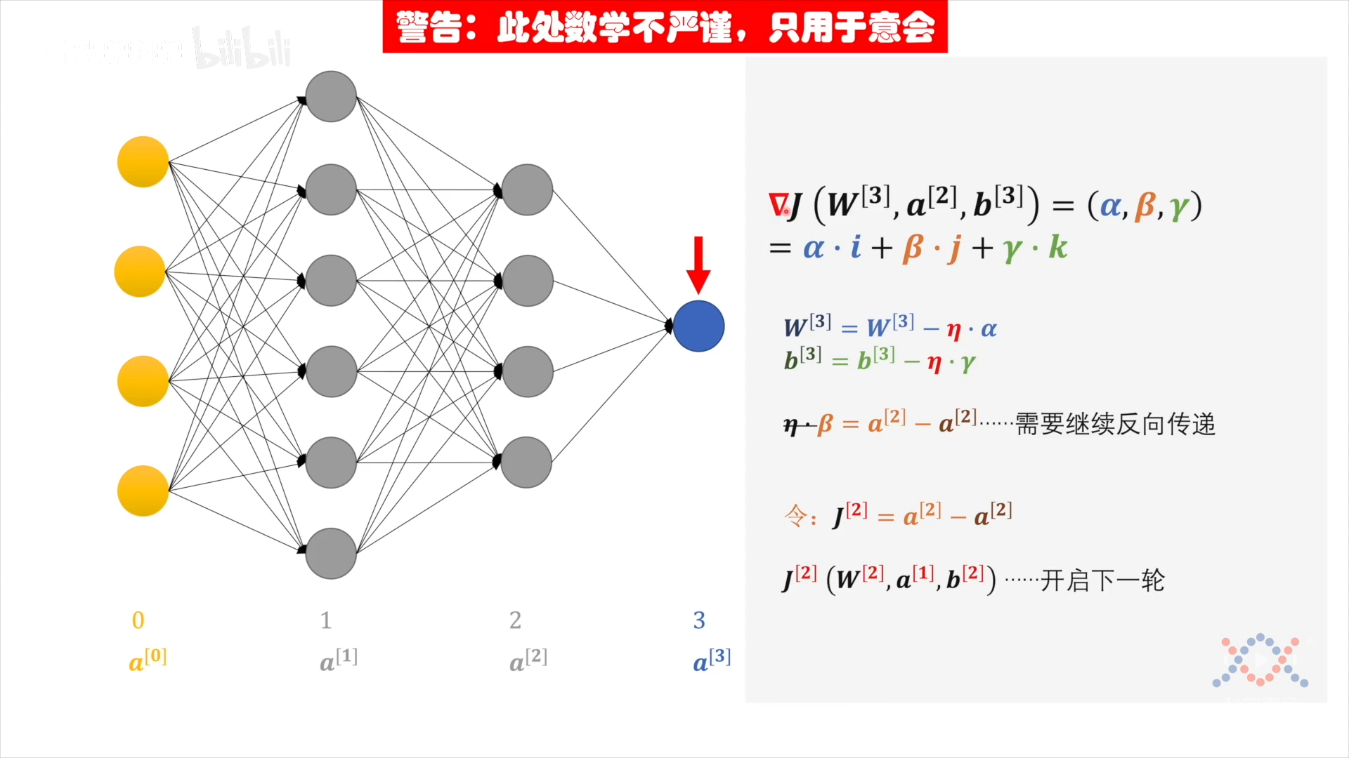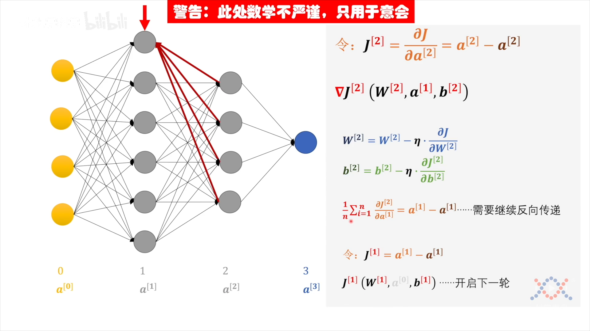 偏差来自三部分:当前层的 w 和 b,以及上一层的输出 $a^{[2]}$。其中 w 和 b 可以根据占比直接调整,而 $a^{[2]}$ 的偏差来自于上一层,按照贡献大小分配偏差: