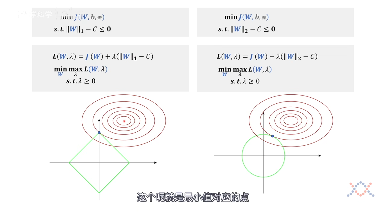 同心椭圆是损失函数 J 的等高线,即每一圈椭圆上,损失值是相同的,中间的灰色图形的最外沿的一圈代表 W 的范数。正方形代表 L1 范数的图像,圆形代表 L2 范数的图像