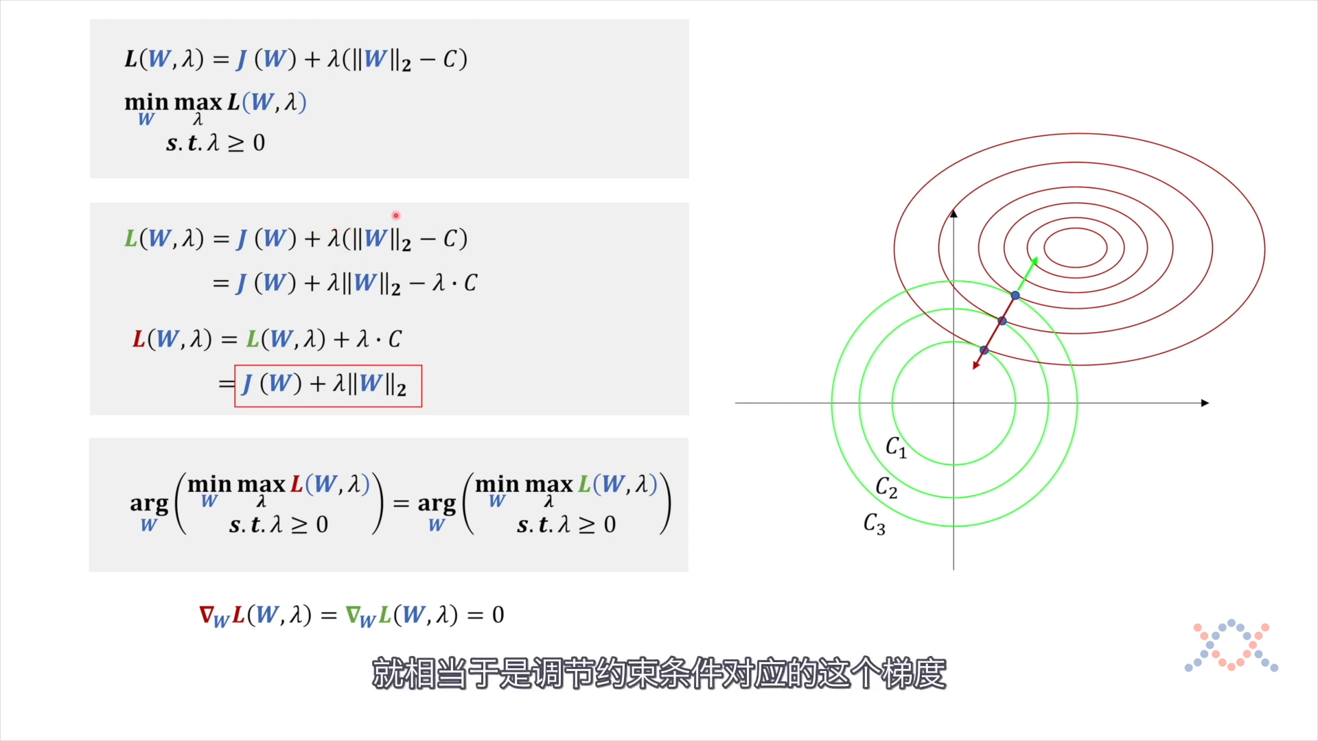 L(𝐖,λ) = J(𝐖) + λ(‖𝐖‖₂-C) = J(𝐖) + λ‖𝐖‖₂ - λC