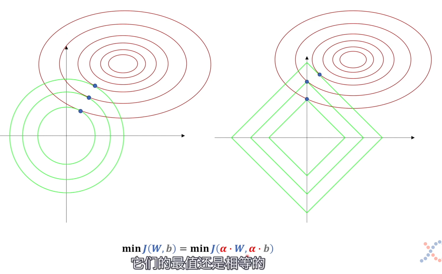因为不同的初始参数 𝐖 最终收敛到的损失函数最小值可能是相等的,比如等比缩放参数时,min J(𝐖 ,𝐛) = min J(a𝐖 ,a𝐛), (𝐖 ,𝐛) 与 (a𝐖 ,a𝐛) 共线(虚线),