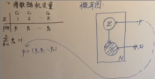 - z latent variable, 隐变量,服从离散分布: K个类别(高斯分布)C₁,C₂,…,Cₖ 分别对应概率 p₁,p₂,…,pK;