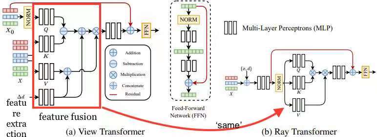 - Analogy the token features as the color in the volum rendering fomula. Therefore, do attention for coordinate-aligned features to aggregate the final color (rgb) for the novel pixel/ray.