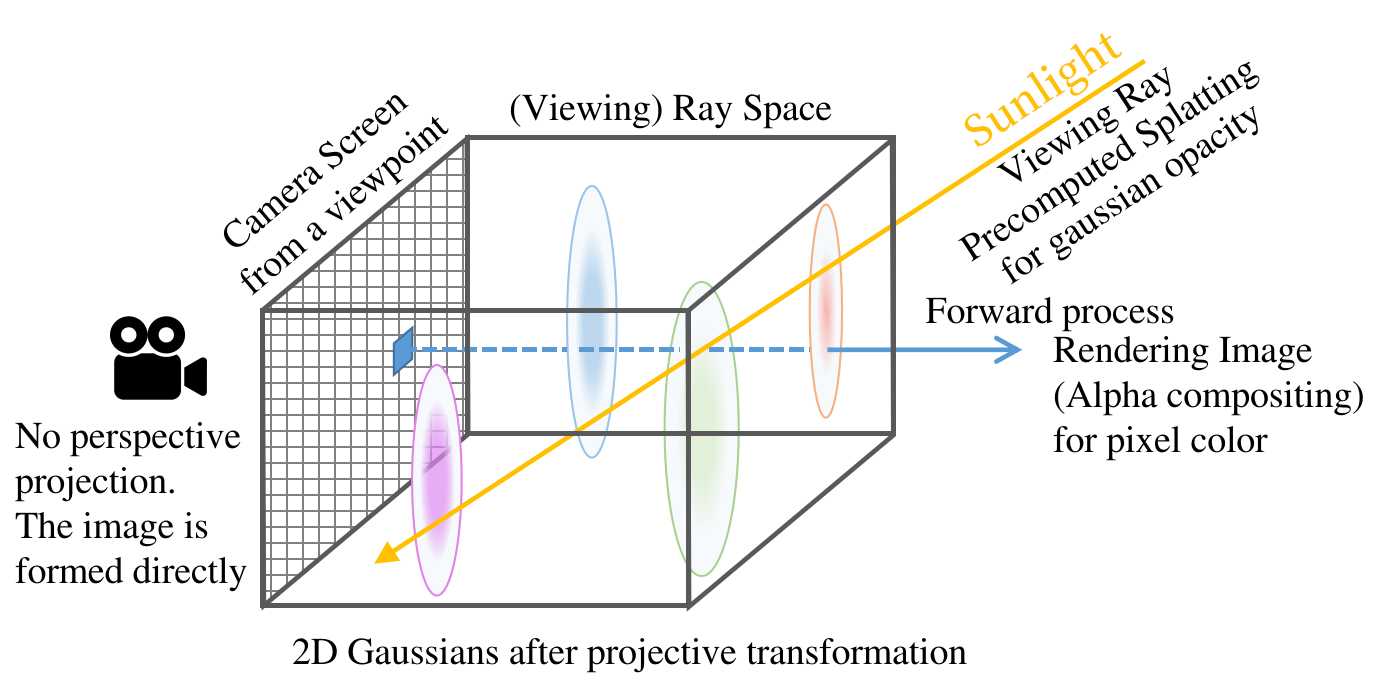 A 3D Gaussian distribution centered at ๐โ with a covariance matrix ๐บโ in the object space will be projected onto 2D screen through the splatting step, resulting in a 2D Gaussian distribution, with applying the affine transformation approximation for the nonlinear perspective division.