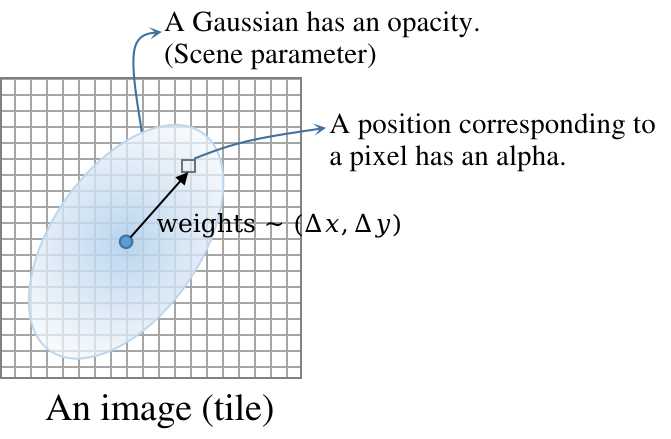 According to $ฮฑโ = oโ e^{-ฯโ}$, where $ฯโ = \frac{\bm ฮโแต \bm ฮโ}{2\bm ฮฃโ’}$ (a scalar), and ๐ซโ is the offset from the pixel center to the 2D Gaussian Gโ’s mean $\bm ฮผ’$, such as $\bm ฮโ = \bm ฮผโ’ - ๐ฑแตข$.