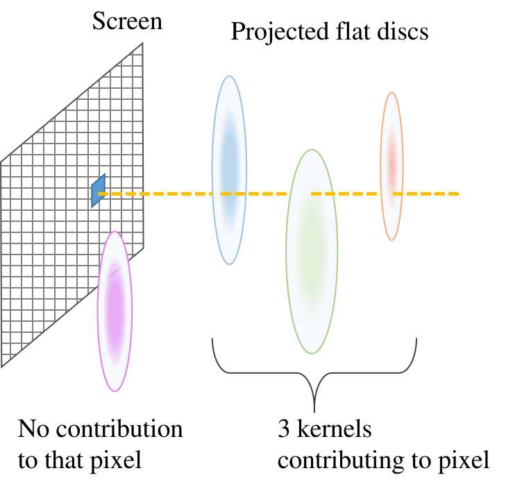 Kernels contributing to the target pixel are determined by whether a kernel overlaps with the pixel after being thrown onto the screen. In essence, the contributing kernel in the ray space is located on the perpendicular line to the target pixel, and its squashed flat disc covers the target pixel.