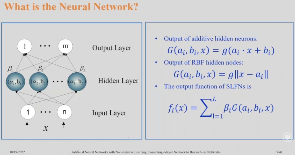 - The output function of SLFNs is: fₗ(𝐱) = ∑ₗ₌₁ᴸ 𝛃ᵢ⋅G(𝐚ᵢ, bᵢ, 𝐱)