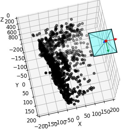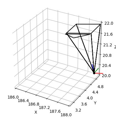 1 2 3 4 5 6 7 8 9 10 11 12 13 14 15 16 17 18 19 20 21 22 23 24 25 26 27import numpy as np import matplotlib.pyplot as plt import pytransform3d.camera as pc import pytransform3d.transformations as pt w2c = np.array([[0.970263, 0.00747983, 0.241939, -191.02], [-0.0147429, 0.999493, 0.0282234, 3.28832], [-0.241605, -0.030951, 0.969881, 22.5401], [0.0, 0.0, 0.0, 1.0] ]) c2w = np.linalg.inv(w2c) intrinsics = np.array([ [ 2.89233051e+03, -2.48063349e-04, 8.23205273e+02], [ 0.00000000e+00, 2.88317528e+03, 6.19070918e+02], [ 0.00000000e+00, 0.00000000e+00, 1.00000000e+00]]) sensor_size = np.array([1600, 1200]) # image size virtual_image_distance = 1 ax = pt.plot_transform(A2B=c2w, s=0.2) ax.set_xlim(186, 188) ax.set_ylim(3, 5) ax.set_zlim(20, 22) pc.plot_camera( ax, cam2world=c2w, M=intrinsics, sensor_size=sensor_size, virtual_image_distance=virtual_image_distance) plt.show()pytransform3d matplotlib